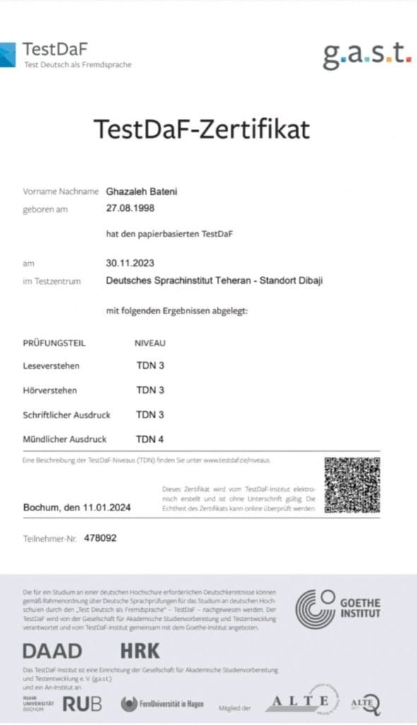 Um die Echtheit des erhaltenen TestDaF-Zertifikats zu gewährleisten, ist jedes Zertifikat mit einem eindeutigen Prüfcode versehen.Mit diesem Code können Sie Ihr Zertifikat über offizielle Kanäle authentifizieren.Dies ist ein wichtiges Merkmal, das es Arbeitgebern und Bildungseinrichtungen ermöglicht, die Gültigkeit Ihrer Qualifikation auf einfache Weise zu bestätigen.